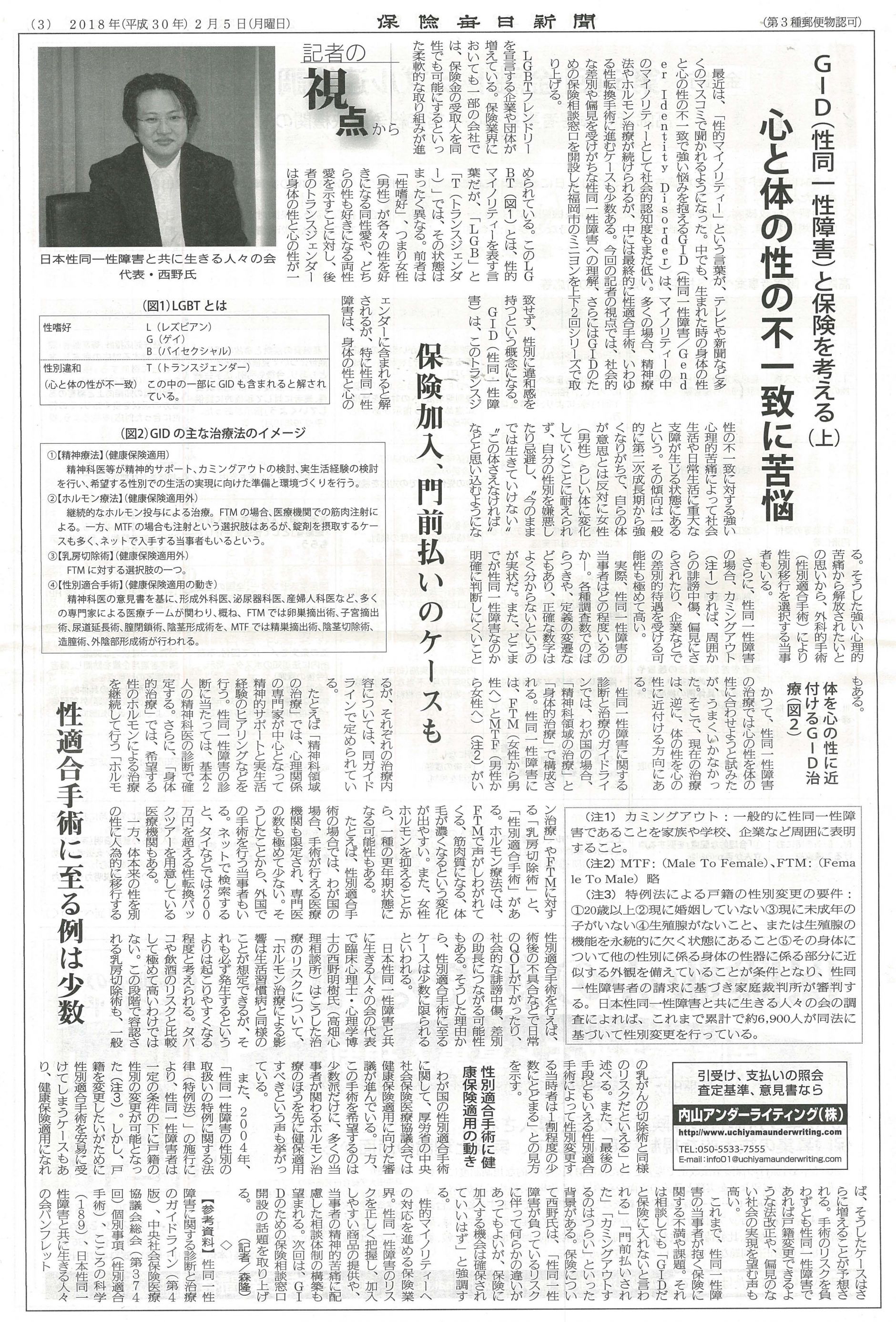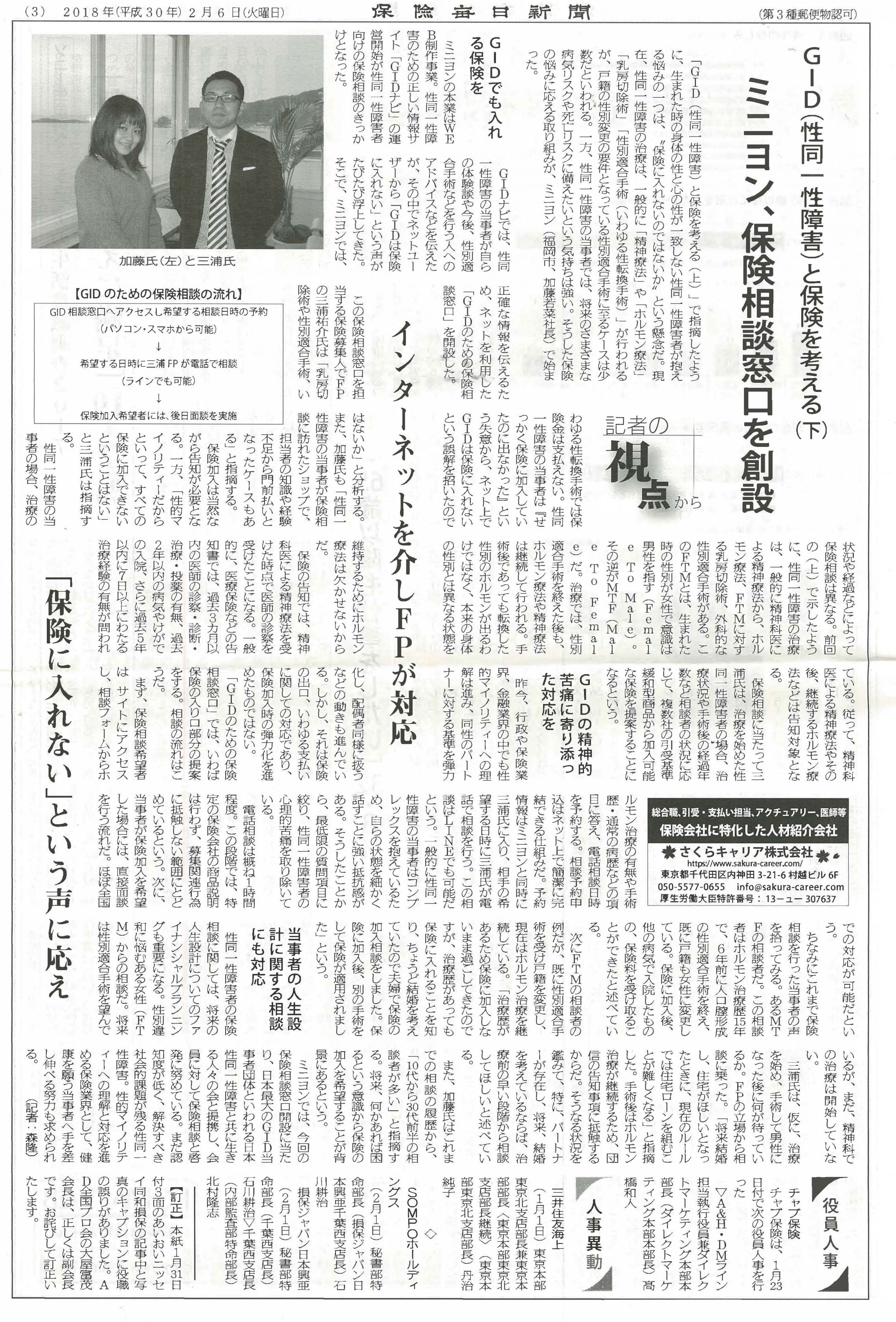 弊法人と株式会社ミニヨン様との提携事業「性同一性障害当事者保険加入機会拡充事業」が、保険毎日新聞に取り上げられました(記者:森 隆 さん)。